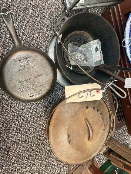 LOT 267 - 2 Unnamed 10x4 Inch Cast Iron Pots and 3 Ladles and a 8 Inch Wagner Skillet