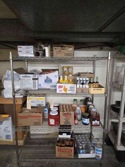 LOT 202 - Contents of Shelf Including Crackers, Mustard, Ketchup A1 Sauce, Caramel Sauce, Sugar Packets, Sugar Substitute Packets, Brownie Mix