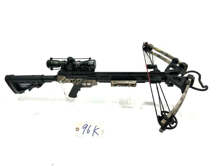 LOT 96k - CenterPoint AXCS185CK Sniper 370 Crossbow Outfit - Serial No. 416M02296 - w/ 4x32 Mounted Scope - 185lb Draw Weight - 370 Feet Per Second - 13.5" Power Stroke - Composite w/ Aluminum Riser/Rail - Comes w/ Several Arrows, Custom Hard Case