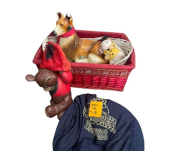 LOT 663 - A Collie in Her Bed 19x15x7 Inchesi also a 10 Inch Teddy Delivering Pizza