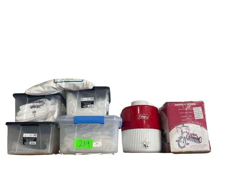 LOT 219 - 4 Containers of Drop Cloths Colman Water Jug with a Radio Flyer Tricycle