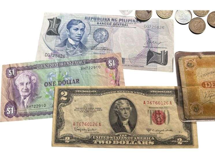 LOT 106 - Lot of Foreign Money - $2 Bill - Francs - Philippines - Canadian - Some Coins