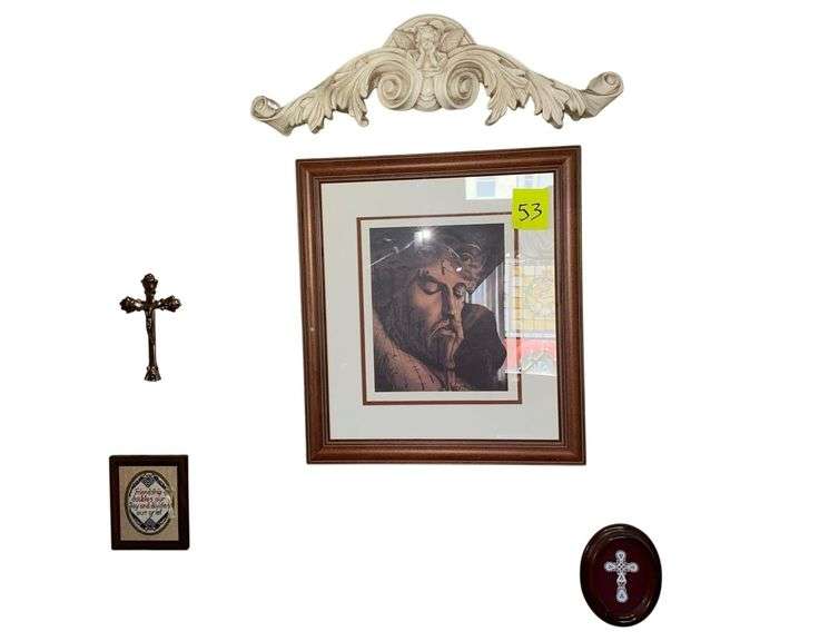 LOT 53 - Contents On Wall Includes- Jesus Print 18 Xx16 Frame Size - Cross Plaque 6” - Frendship Plaque 6” - Brass Crucifix 7” -,Wooden Cherub Swag 20”