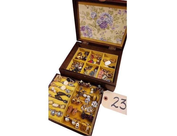 LOT 23 - Wooden Jewelry Chest with Large Lot of Vintage Clip Earrings