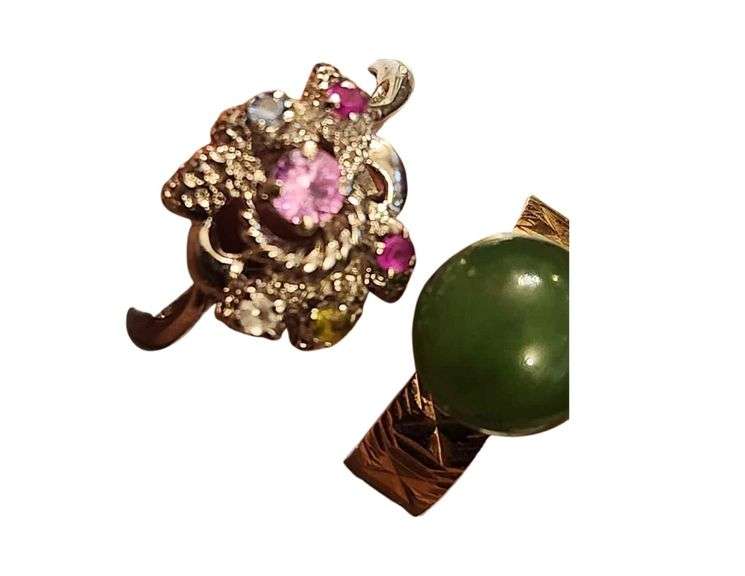 LOT 18 - 2 Gold Rings - (1)14 K Gold Band with Green Round Stone, Size 6.5 - (1) 10Kt White Gold Ring size 8 with Various Stones Total Weight 0.216 t oz